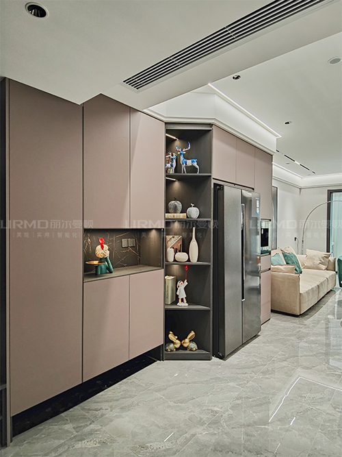 做了一個開放格的轉(zhuǎn)角裝飾柜來過渡嵌入式冰箱柜,整體美觀大氣又實用。