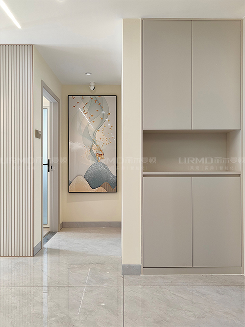 全屋衣柜、櫥柜、房門、護墻板都選用奶咖色系配套。
