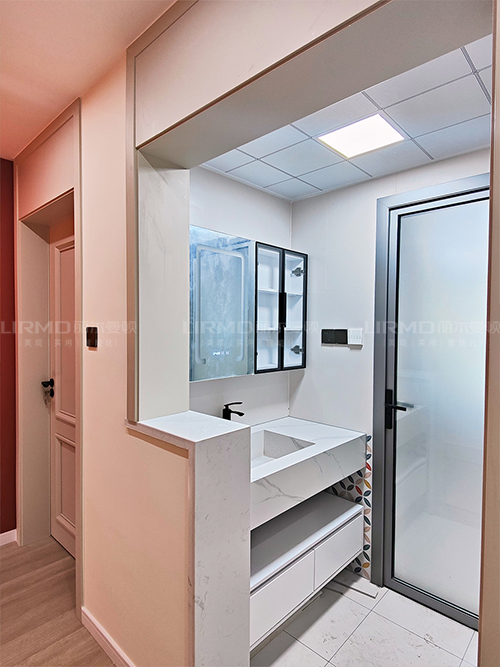 右側一門到頂膚感柜門,干凈又不失質感,滿滿的收納空間。