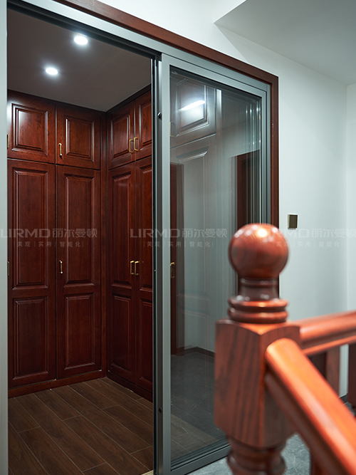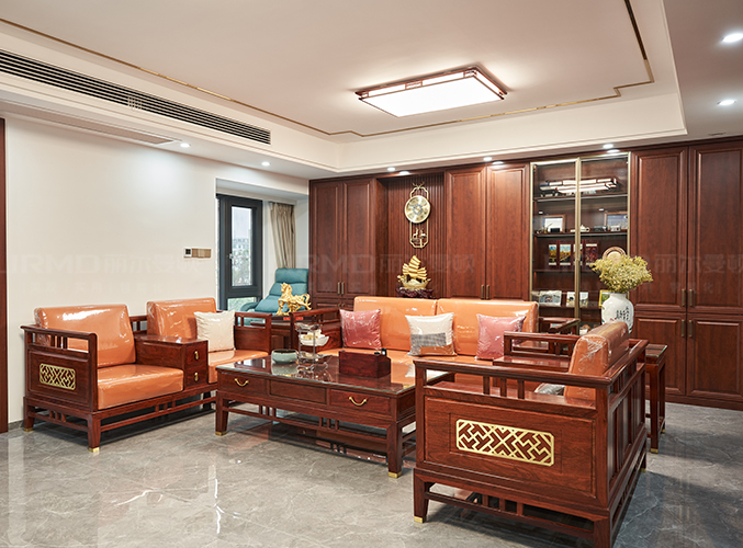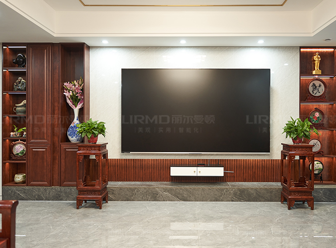 超大開間客廳背景墻用來做裝飾柜,玻璃門內(nèi)嵌燈帶穿插格柵板設(shè)計(jì),高級(jí)感一下就出來了。