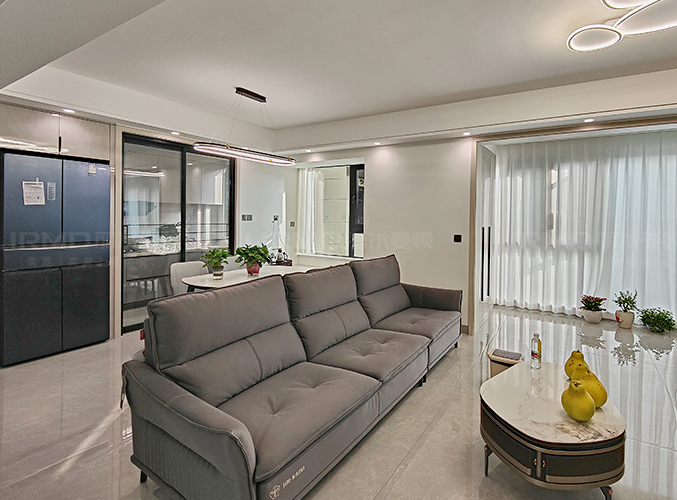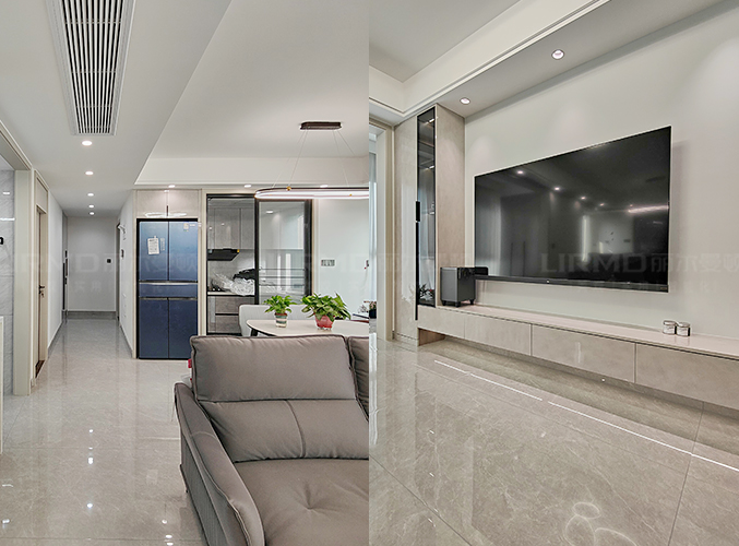 全屋通鋪瓷磚,顯達(dá)敞亮,冰箱做內(nèi)嵌處理不占空間,灰白紋理的電視背景墻,