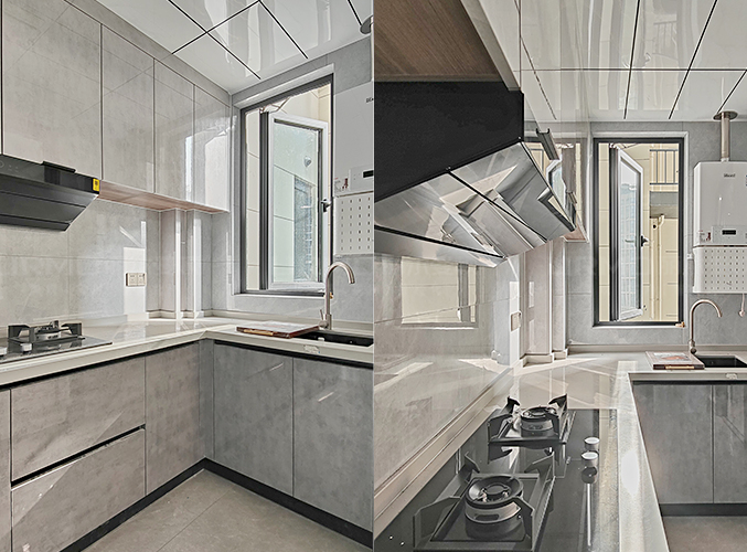 立面簡致,紋理細(xì)膩,增加了瓷磚防油漆,上方有餐柜,視覺層次更加豐富,