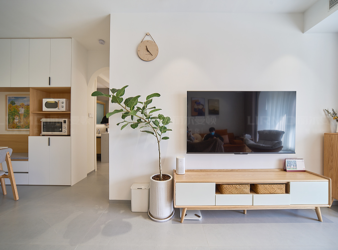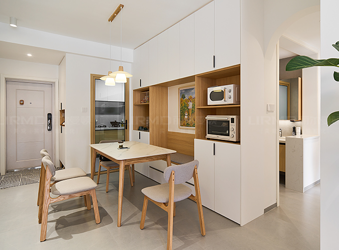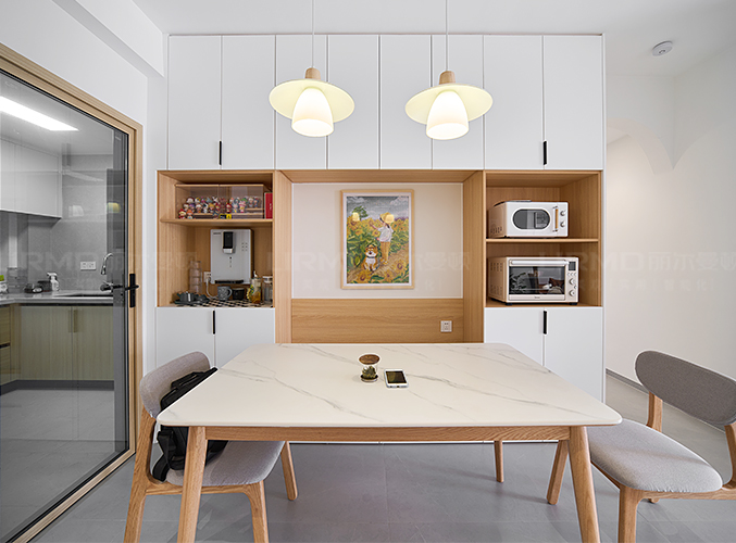 一整墻餐邊柜,中間臺面預留了插座,可放置一些小家電,其余柜子用來收納生活雜物,