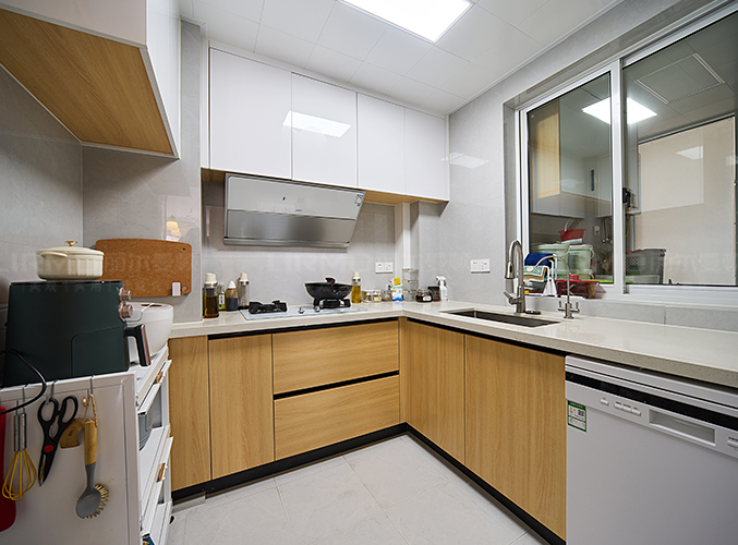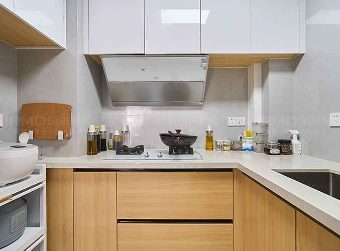 簡約大氣,上下方都有收納柜,視覺層次更加豐富,分擔了廚房收納還可以減少了儲物壓力。