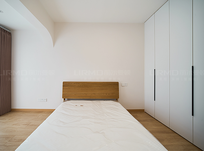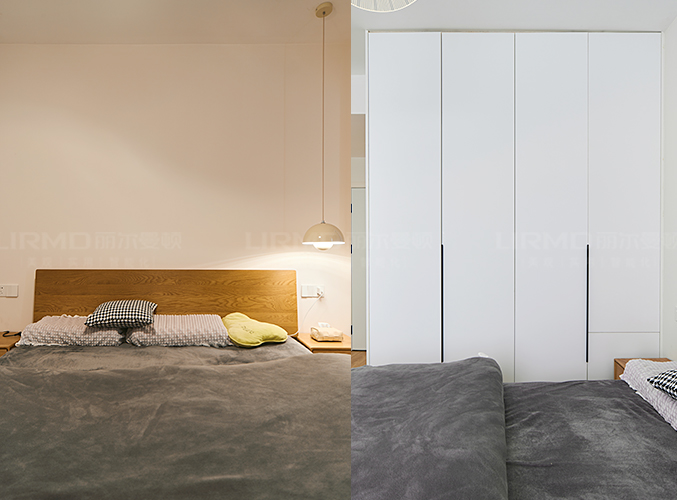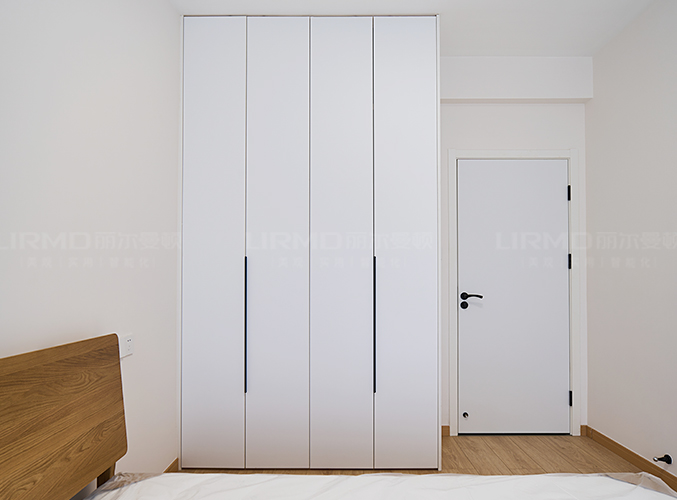 柜子一門到頂設計,實木柜體搭配PET膚感柜門,床邊搭配暖色系吊燈,