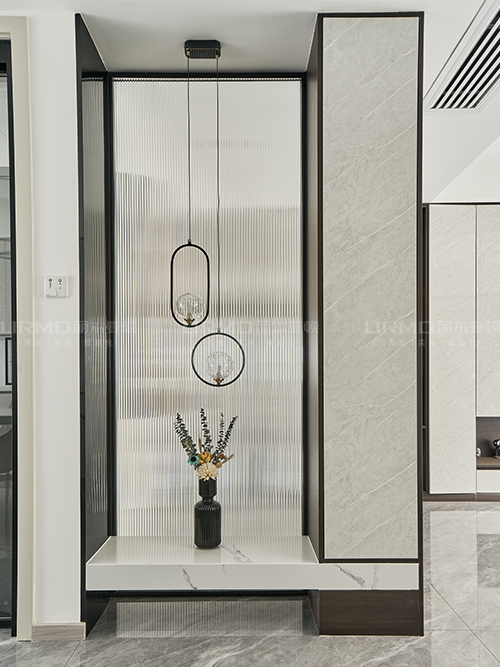 可以放置鑰匙包包等物品。玄關(guān)長(zhǎng)虹半透玻璃結(jié)合柜體穿插設(shè)計(jì),更顯時(shí)尚。