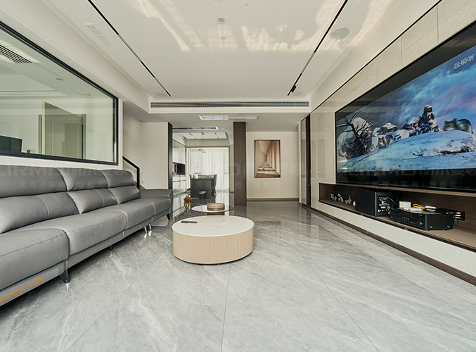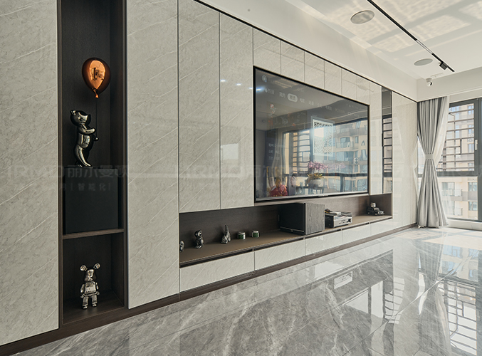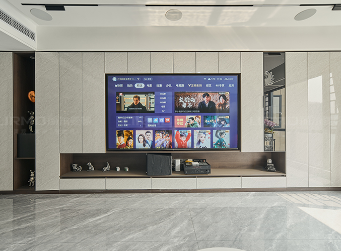 整屋通鋪瓷磚,盡顯大氣,電視背景做整面撞色收納柜,滿足視覺(jué)效果的同時(shí),也能增加儲(chǔ)物空間。