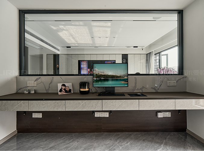 砸墻做半墻玻璃,書房客廳更加通透,超長(zhǎng)書桌設(shè)計(jì)加正面書柜設(shè)計(jì),學(xué)習(xí)辦公兩不誤。