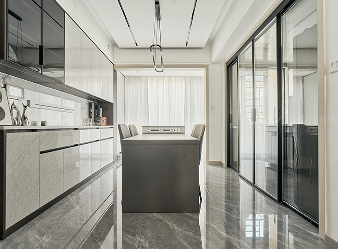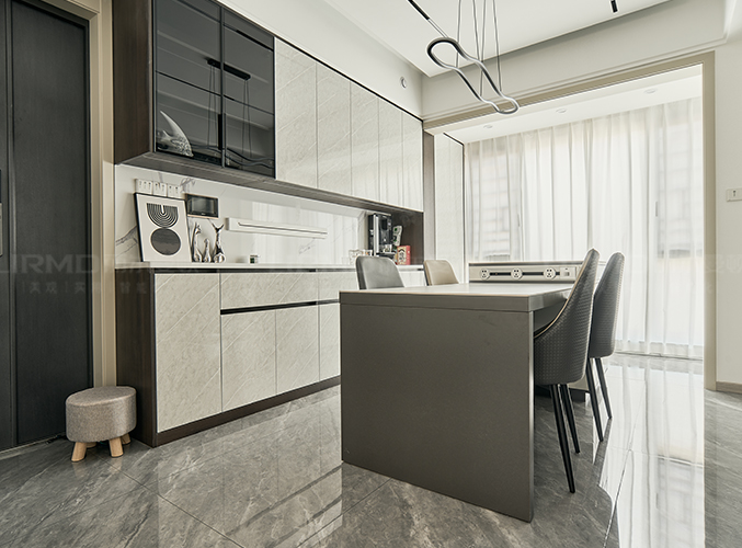 餐桌島臺(tái)設(shè)計(jì),可以做西餐,下方是儲(chǔ)物柜,可以放家用小電器,島臺(tái)側(cè)面裝了軌道插座,