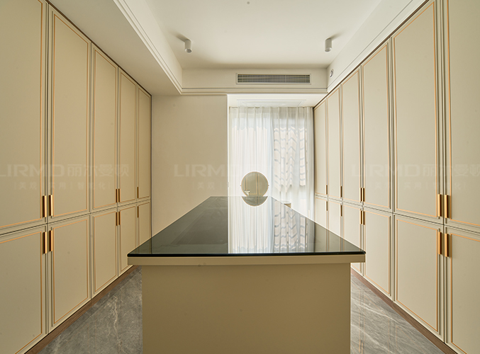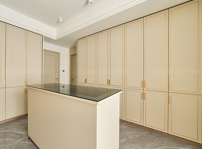 U字型設(shè)計(jì),柜子象牙灰色鑲嵌金屬邊框,分段造型柜門設(shè)計(jì)僅限優(yōu)雅檔次,