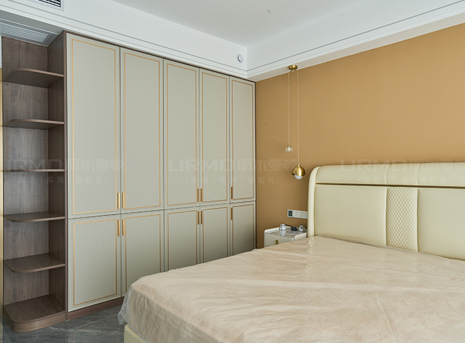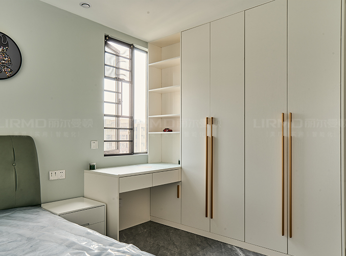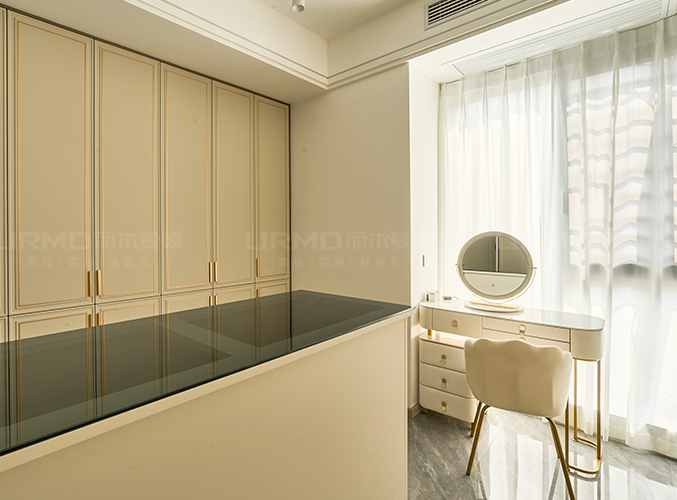 整面墻做衣柜,更加好分類,柜子象牙灰色鑲嵌金屬邊框,側(cè)邊做一個(gè)圓弧角處理,