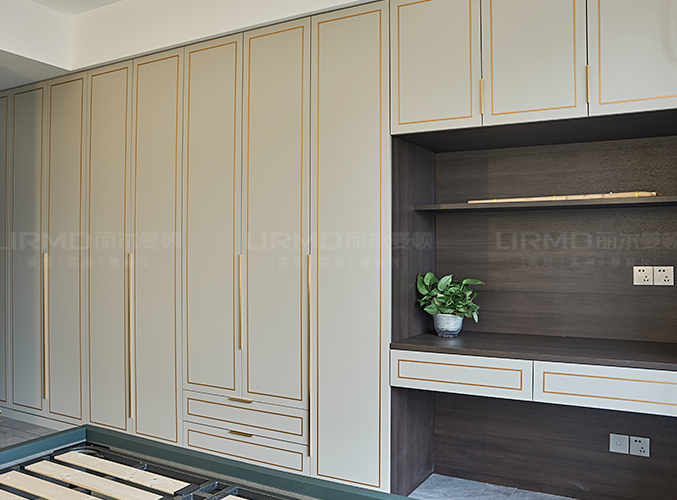 墻柜一體化,象牙灰柜門鑲嵌金屬邊框,與柜門同款式,尤加利護墻板同色配套房門柜體更顯精致,
