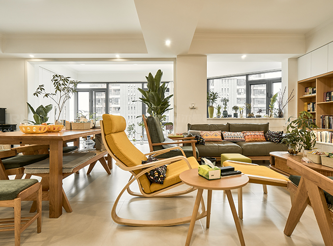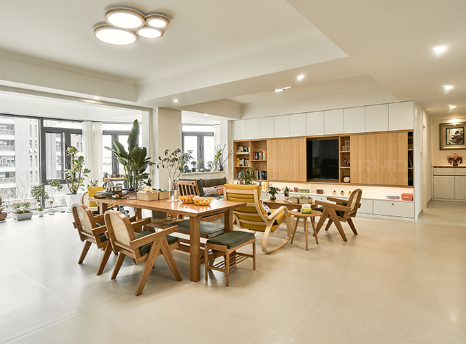 整屋大白墻,柔光瓷磚通鋪,空間大,采光好,可以放置各種綠植,電視背景墻設(shè)計幾盒壁龕放置