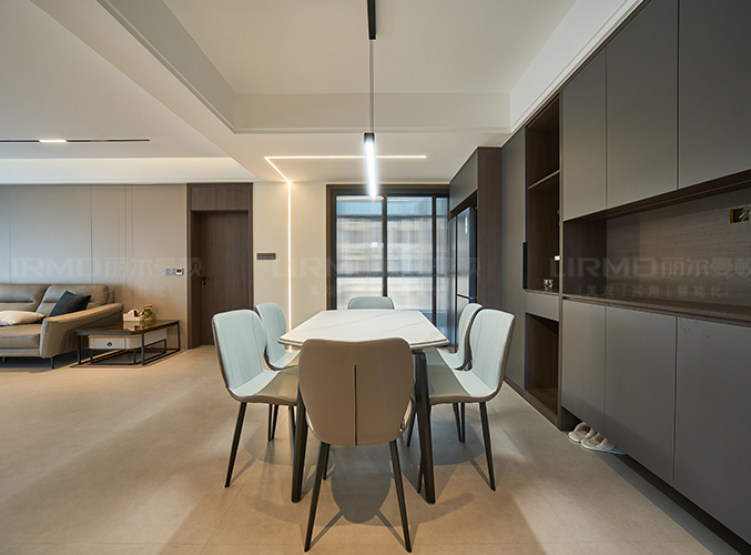 餐廳做同款餐邊柜,入戶收納+飲水機(jī)+冰箱實(shí)現(xiàn)多功能化,中間預(yù)留管線設(shè)計(jì),下方懸空設(shè)計(jì),