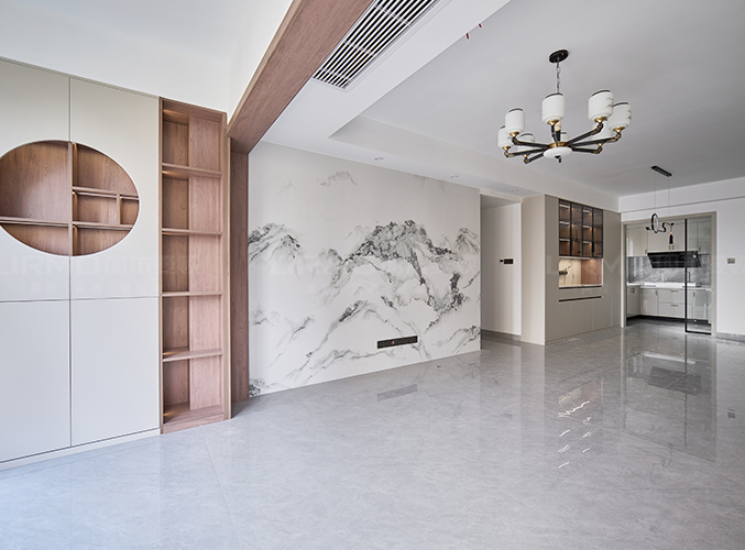 客廳大瓷磚通鋪,背景墻采用山水畫裝飾增添中式韻味。