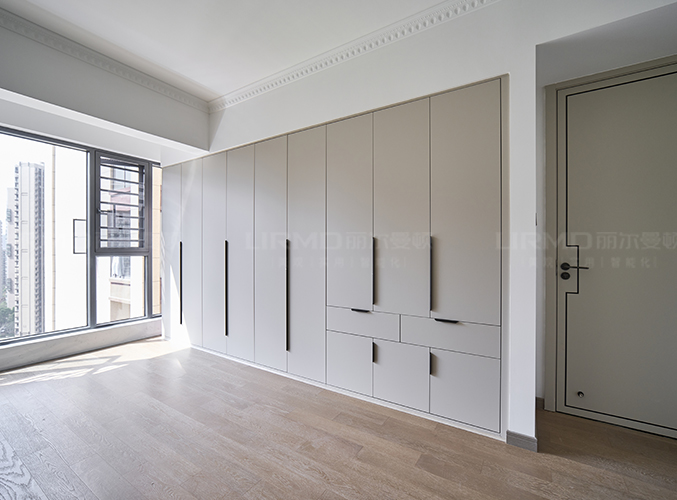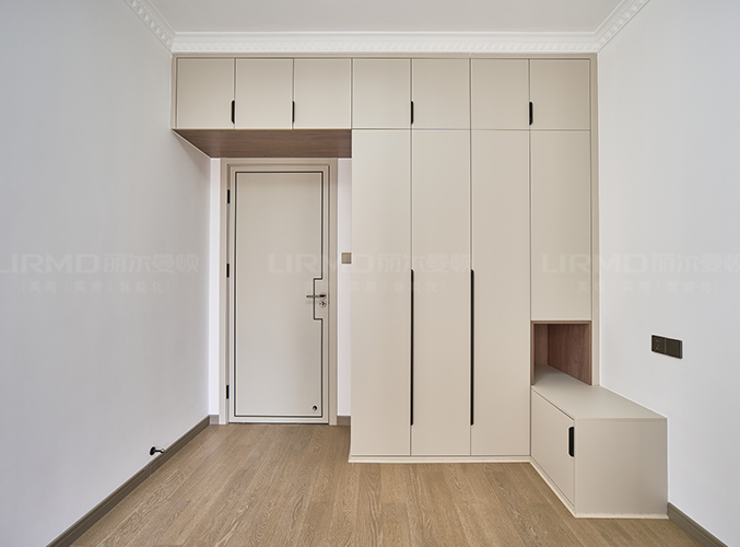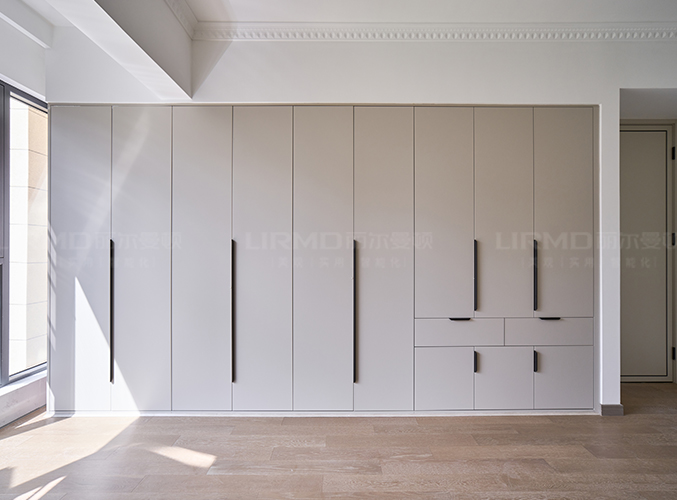 實木柜體搭配PET膚感柜門,質(zhì)感超不錯,同款膚感滿墻衣柜,極簡黑色金屬拉手簡單大方易打理,