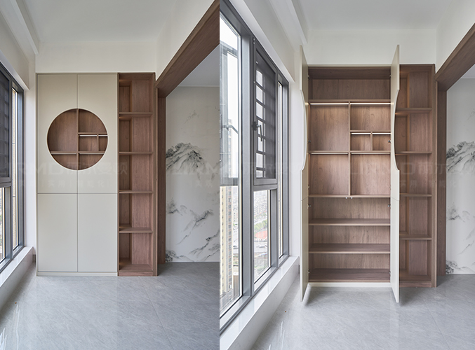 陽臺與客廳取消隔斷,空間更通透,柜門做圓形鏤空造型,氛圍拉滿。