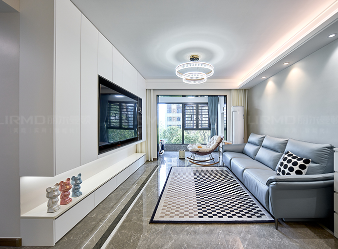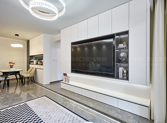 整屋通鋪瓷磚,盡顯大氣,整墻電視背景墻設計,右邊和下方內嵌式設計,