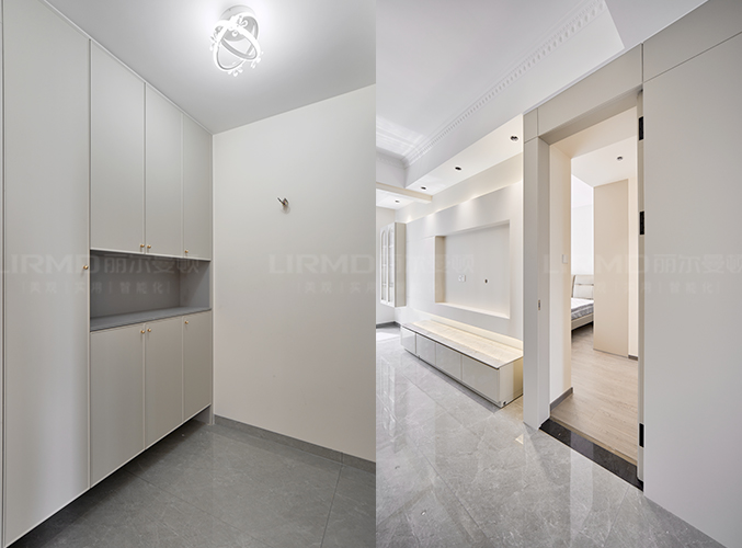 18mm厚杉木芯板,好放置鞋子,中間內嵌設計,可以放置鑰匙包包等物品,轉角與隱形房門、