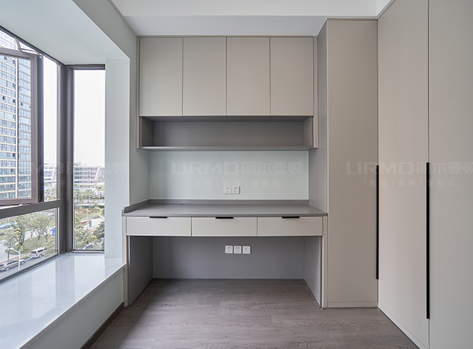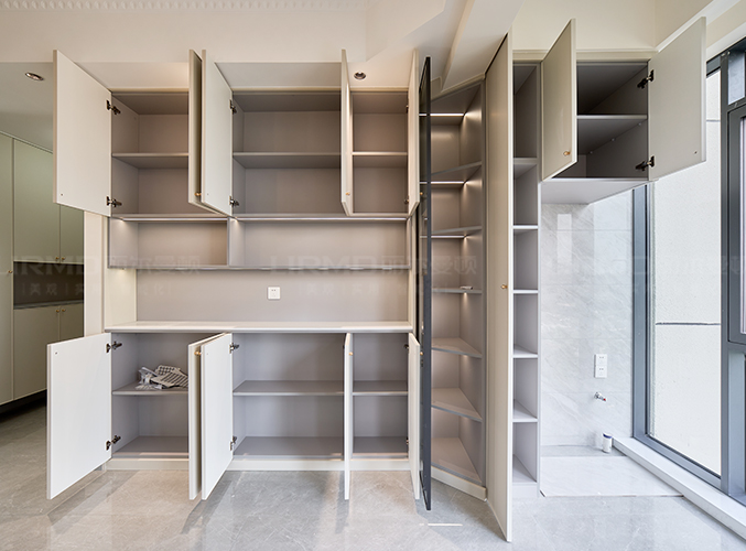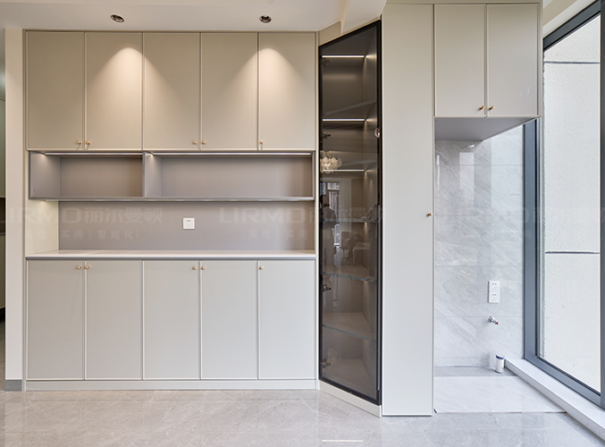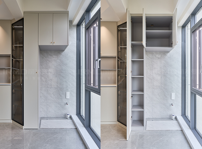 餐邊柜銜接陽臺洗衣機柜,象牙灰柜門搭配夢幻灰柜體,同色系搭配,使空間更加柔和,