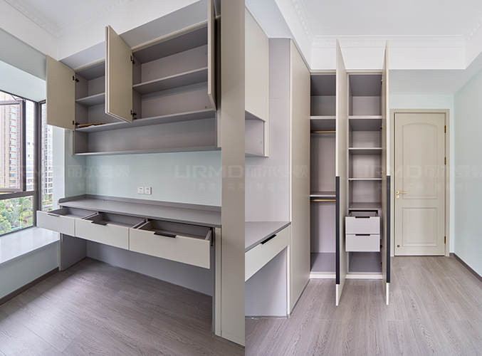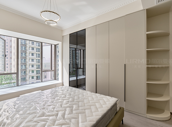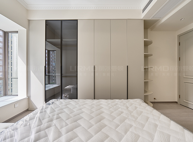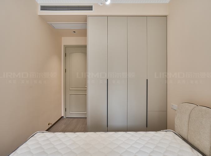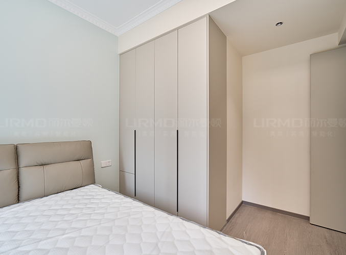 靠墻做整墻衣柜,七葉柜門實現四季衣物分類,多組衣柜設計,收納更加方便。