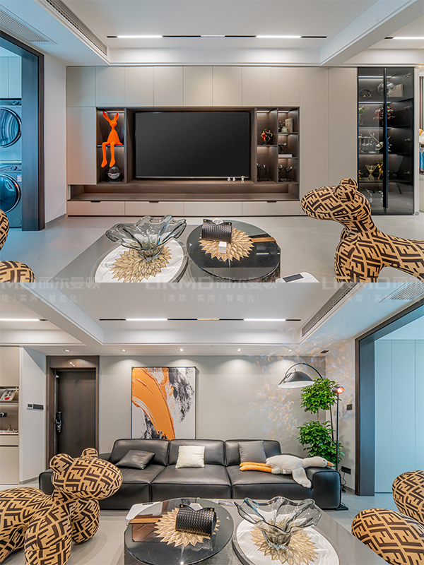 空間色調(diào)整和諧體統(tǒng)一,主要黑白灰三個(gè)色調(diào)為主基調(diào),為了不使空間單調(diào)深沉,增加撞色處理,