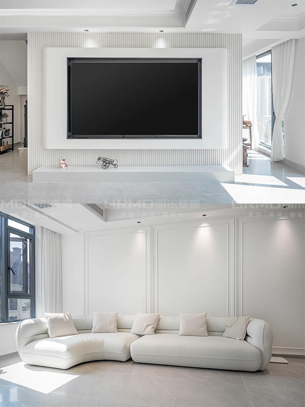 拉伸比例,電視墻注重實用以及視覺的拉伸,沙發(fā)背景制造視覺框效果