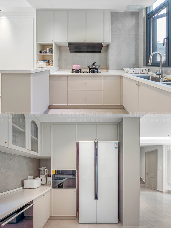 柜門板造型采用經(jīng)典的法式弧形線條,搭配黃銅拉手,小燈芯玻璃門透出暖色燈光,提升家居氛圍感,