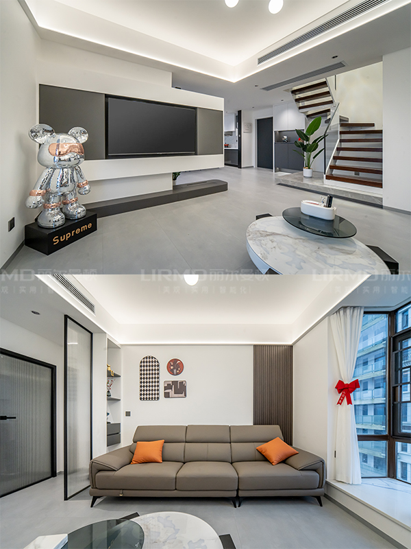 客廳做了懸浮電視背景,正對沙發(fā)采用背景墻+長虹屏風(fēng)隔斷。