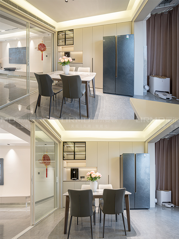 餐廳和客廳用透明玻璃門做隔斷,可以更好的隔絕油煙