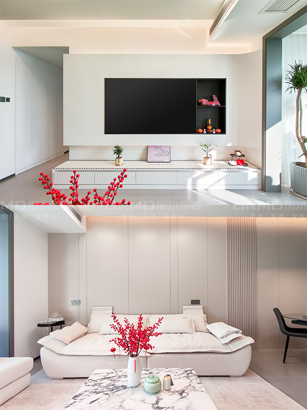 電視背景墻做凸出留白+弧形設計,簡約又有層次設計感