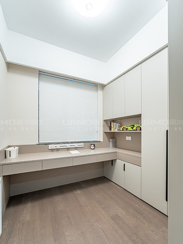 書柜轉(zhuǎn)角書桌一體式設(shè)計,視覺上形成 L 型布局,增加空間連貫性。