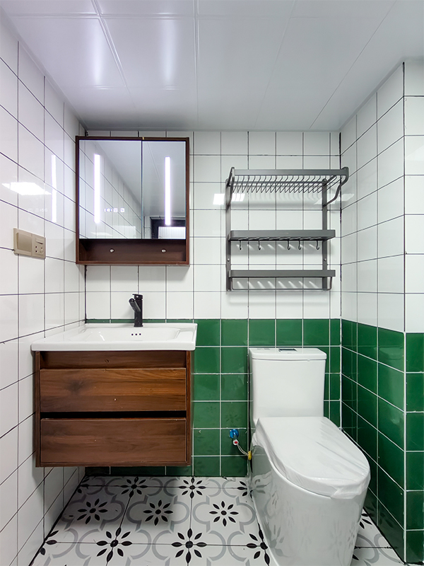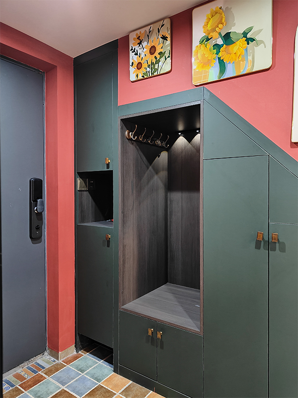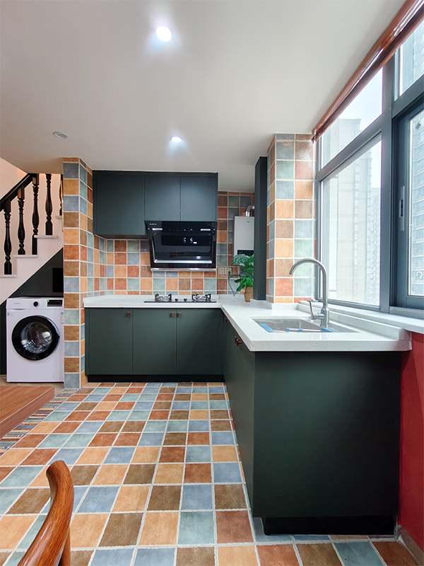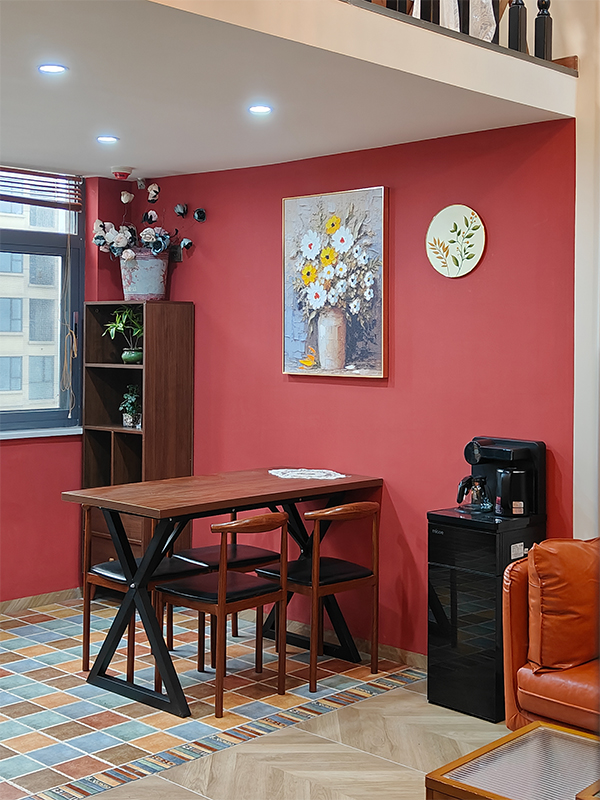 撞色搭配帶來的設計感,精致又復古,木質柜與綠植等元素構成主要特色