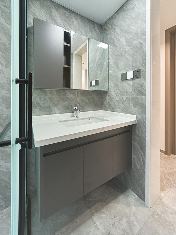 門墻柜一體化,柜子濟州灰與木卡其的搭配為整個空間的主色調,地面磚的大理石灰為基礎色調
