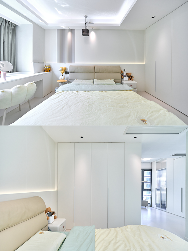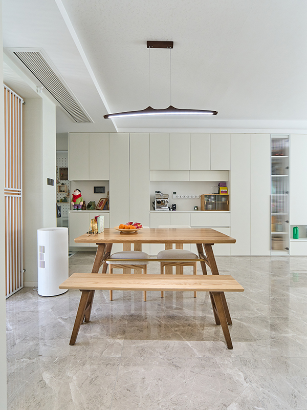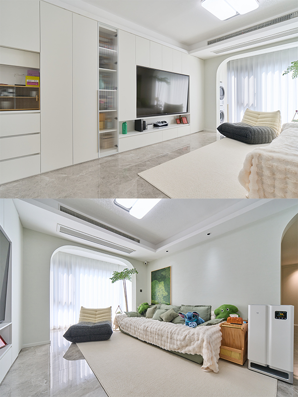 滿墻電視柜用開放格和玻璃門做點綴,讓整個空間高級又細膩