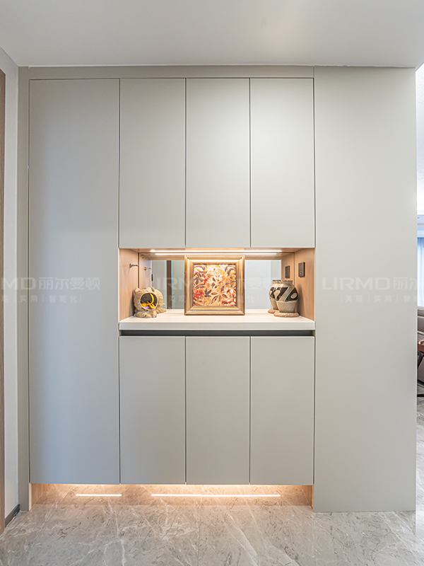 玄關加收納的轉角一體柜,銜接了玄關和客廳,讓整體空間更顯統(tǒng)一
