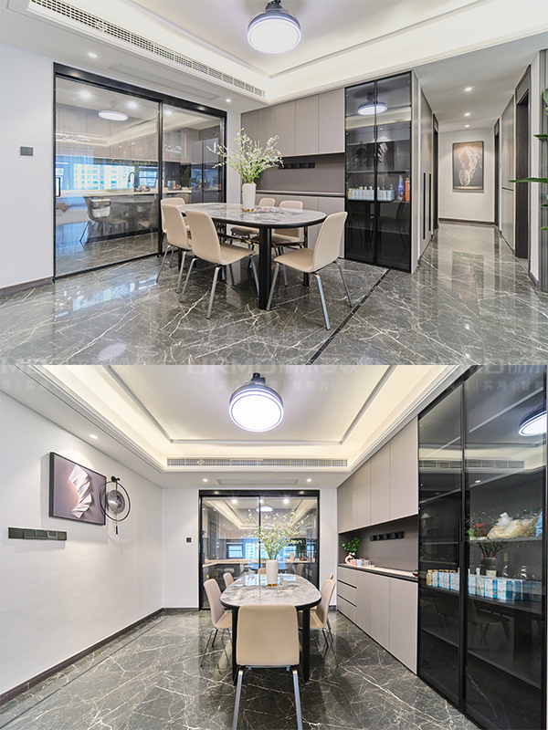 墻板運用同色門板上墻穿插大理石紋路墻板,與暖色燈光相結合,讓沉穩的空間也不失溫馨