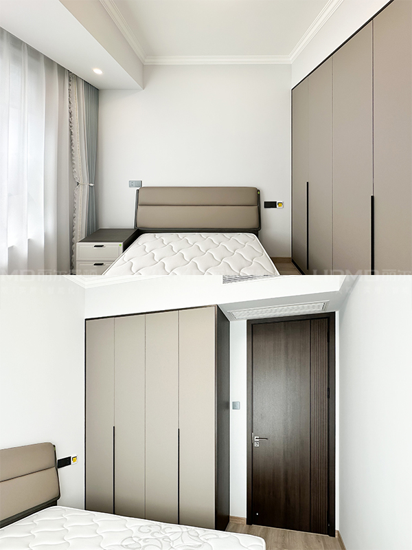 主臥床假懸浮式安裝人體感應(yīng)燈帶,飄窗一個顏色的墻板和諧統(tǒng)一
