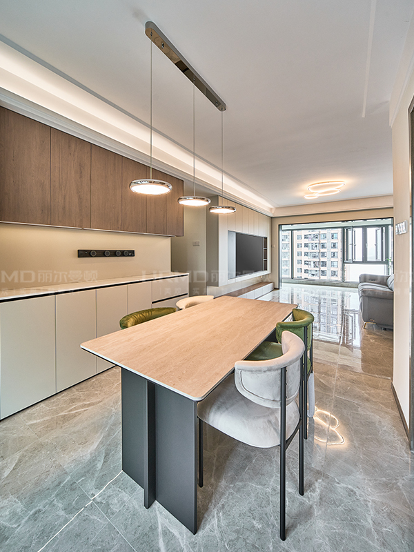 餐邊柜全系無拉手設(shè)計搭配金絲橡木的撞色搭配,視覺感官上盡顯盛宴