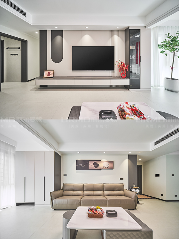 一字懸空電視柜,右側(cè)搭配玻璃柜作展示柜,還能防灰防塵,適應(yīng)不同大小物品收納空間需求