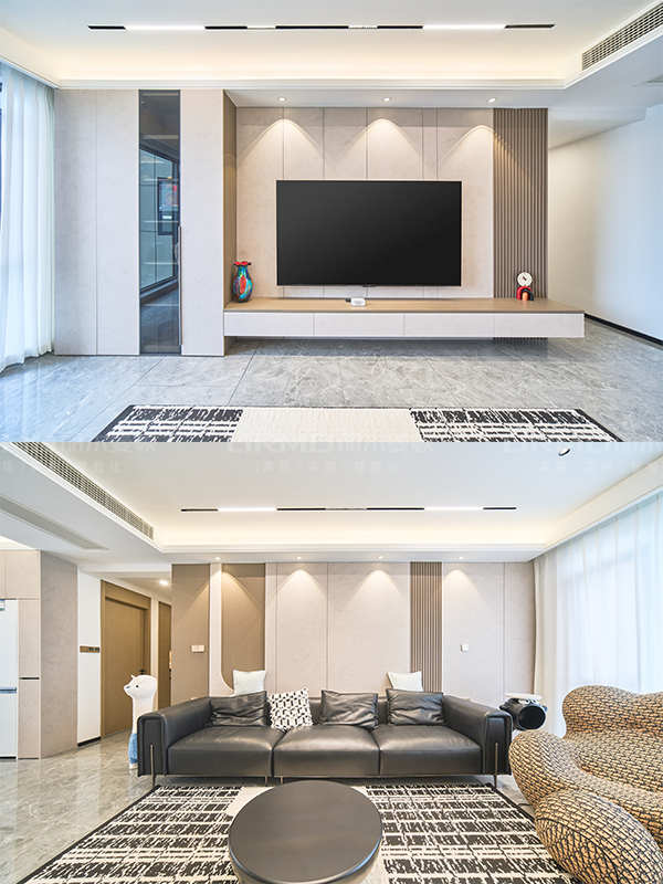 電視柜陽臺柜相連接,沙發背景墻做了幸福包,讓整個客廳顯得有層次感