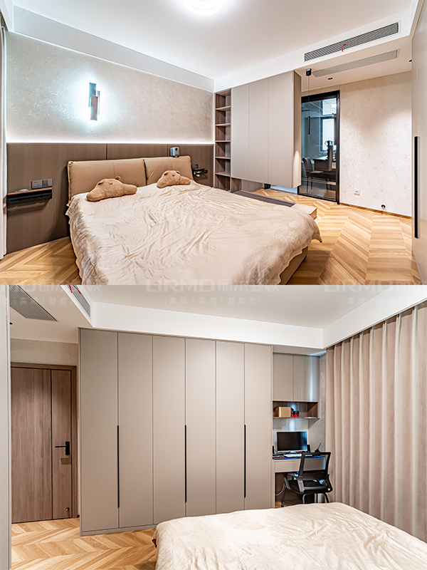 主臥大套間,整面墻做收納衣柜,結(jié)合半墻造型隔斷,讓空間不顯單一。