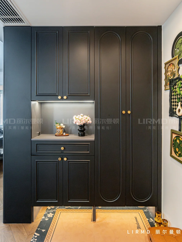入戶玄關(guān):金剛黑柜門搭配金色拉手,大氣不占地!底部懸空放拖鞋,中間鏤空隨手放鑰匙,實(shí)用值MAX