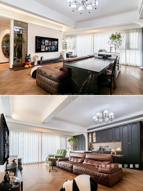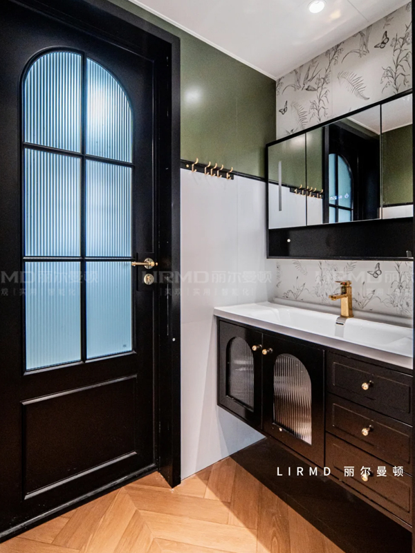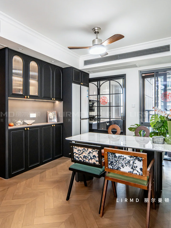 石膏線雕花+黑色踢腳線,細(xì)節(jié)呼應(yīng)法式復(fù)古的秩序感