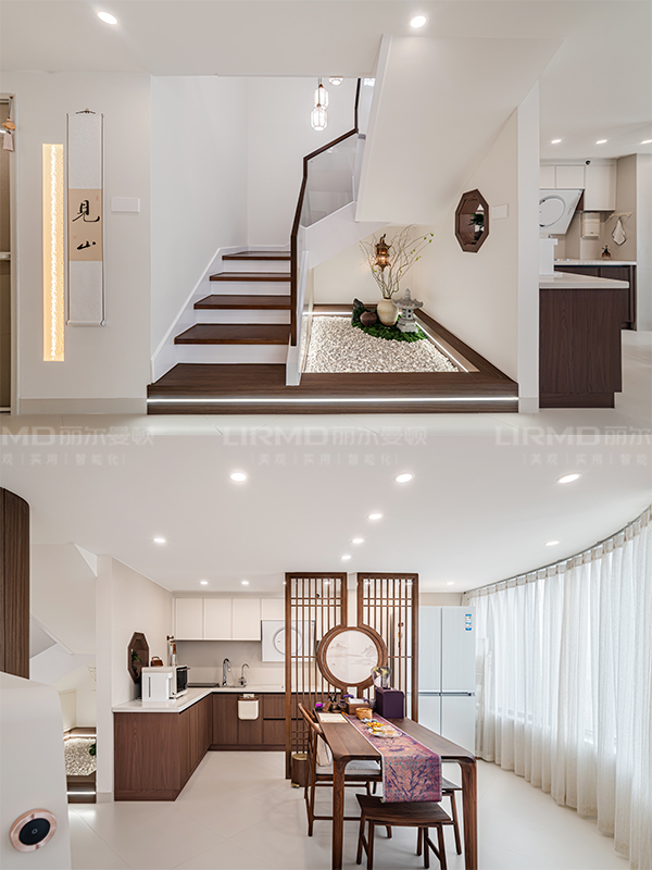 全屋用了很多中式元素但又不刻意,比如木質踢腳線、雕花隔斷、圓形拱門等,每一處都透露著精致。
